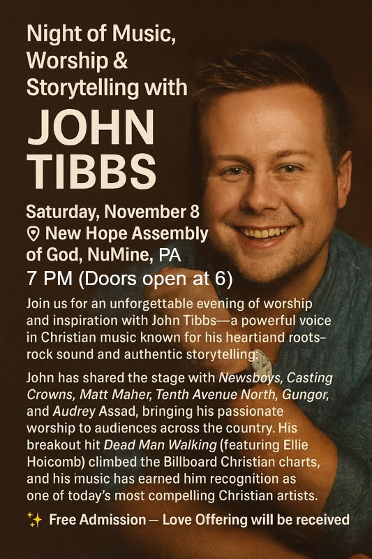 Join us for an unforgettable evening of worship and inspiration with John Tibbs – a powerful voice in Christian music known for his heartland roots, rock sound, and authentic storytelling.